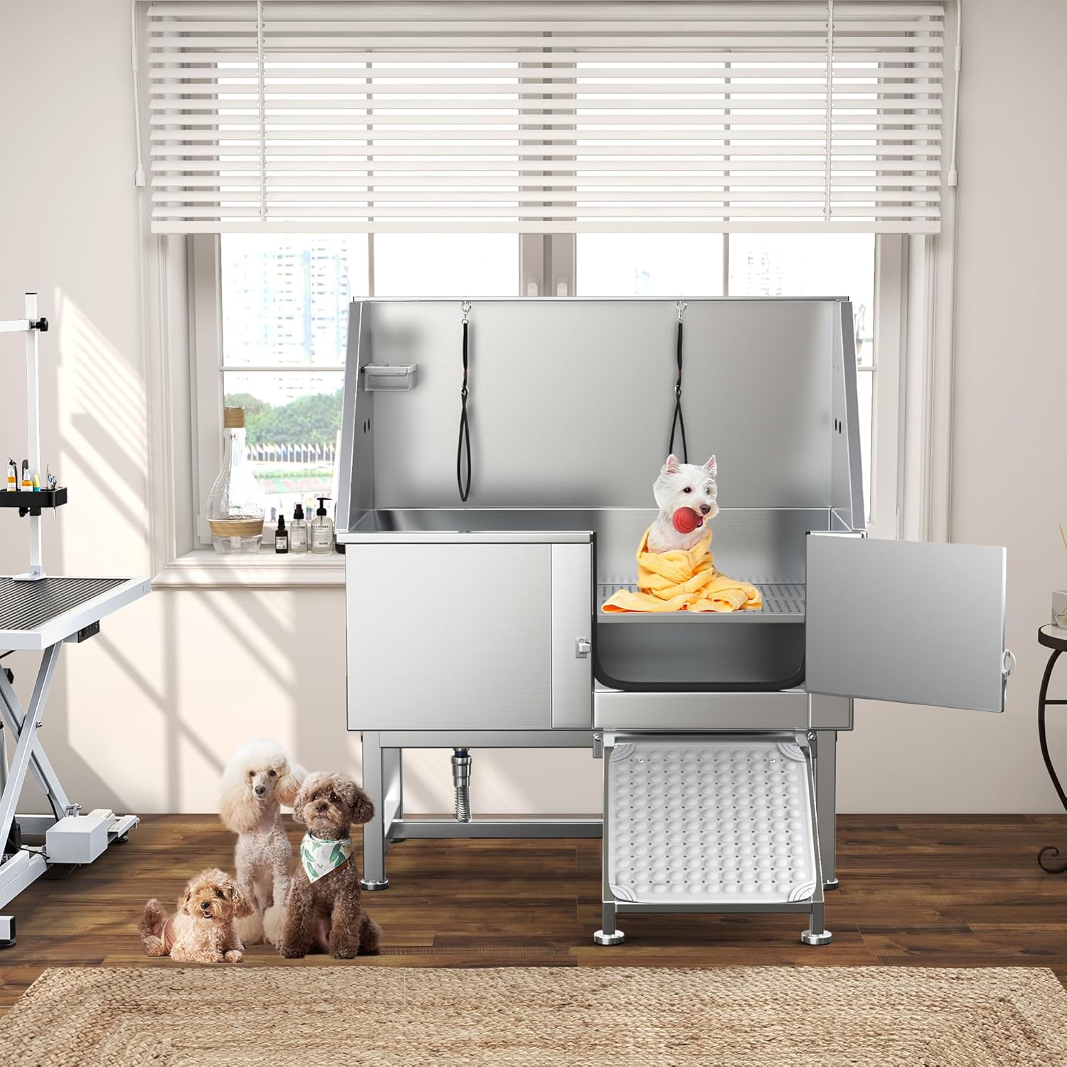- Great Construction: 50in professional dog bathtub's body boasts a 304 stainless steel with a load capacity of 330 lbs; It resists deformation and rust, ensuring easy cleaning and lasting durability; The fully welded one-piece design prevents water leakage and allows easy installation