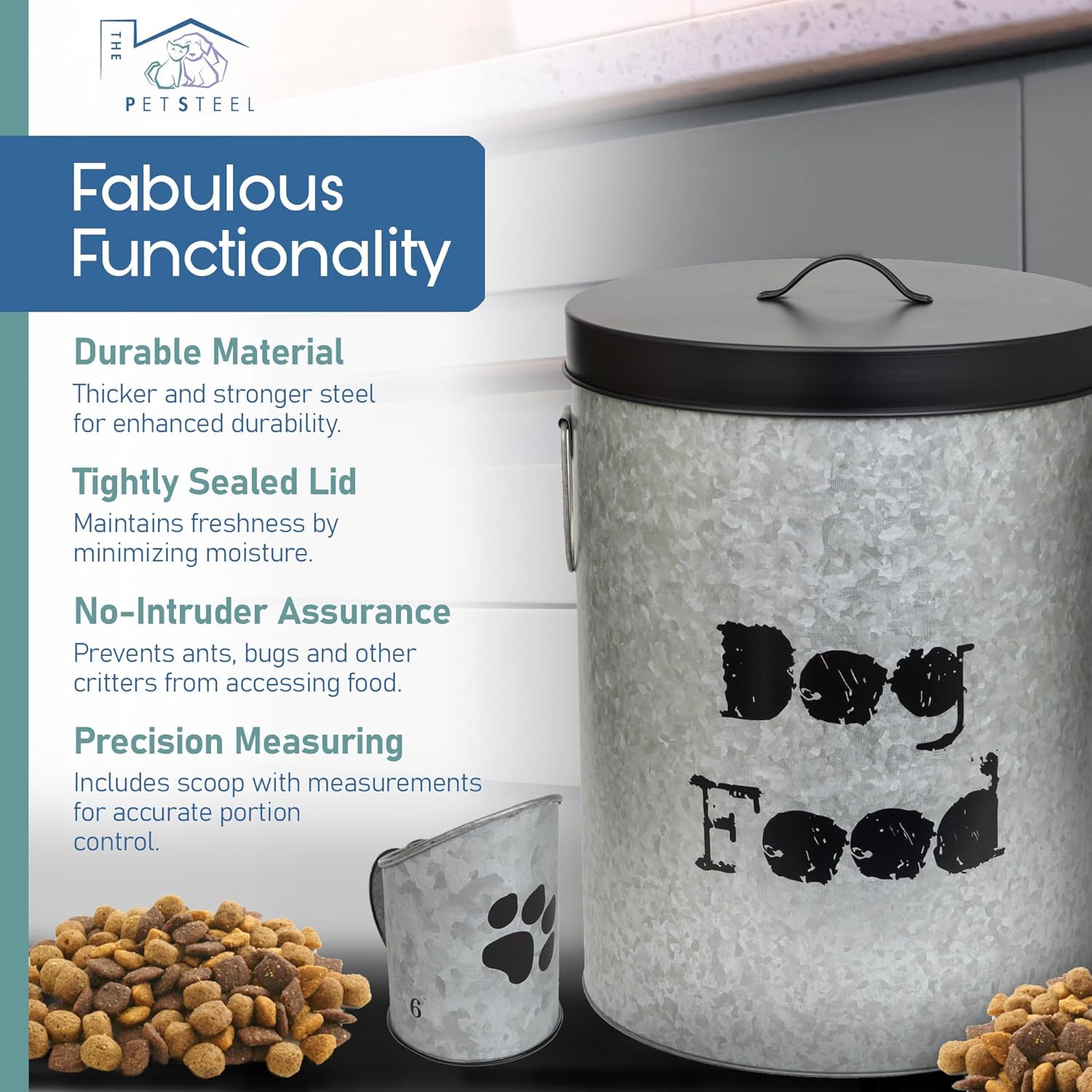 - Clean and Convenient Serving: PetSteel’s innovative pet food storage container comes with a complementary scoop, making feeding your pet easy and mess-free. For added convenience, you can store the scoop on top of the container or inside, depending on your preference.