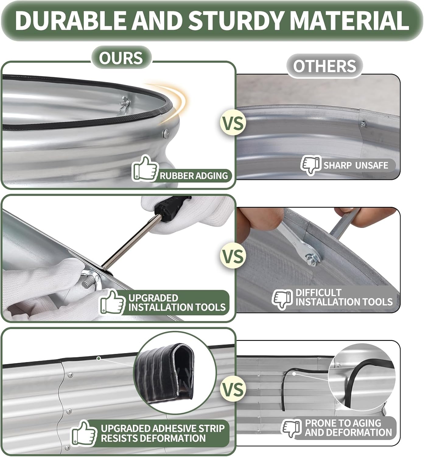 - 【Safety Edge Design & Durable Rubber Strips】The garden bed's top and bottom edges are folded to eliminate sharp edges, ensuring safety from all sides. Rubber strips add extra protection and cushioning, with built-in patches for durability. The galvanized planting box offers the perfect solution for creating your ideal vegetable garden. With the 1More raised bed, enjoy a worry-free gardening experience, prioritizing your safety and convenience. The ultimate choice for a hassle-free and enjoyable