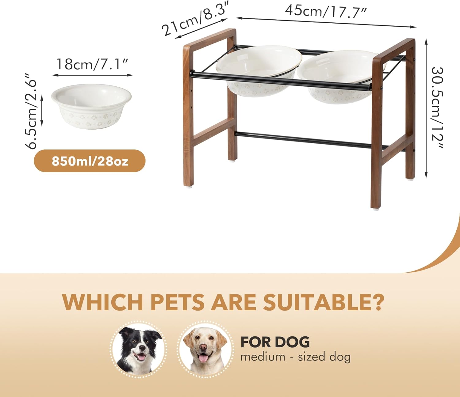 - Acacia Wood and Metal Stand: This stand combines classy acacia wood with metal rods, which is aesthetically pleasing and fits perfectly with any home decor style. Raised ceramic dog bowls provide dogs with correct eating posture, help reduce bloating and neck strain in dogs, and prevent indigestion problems.