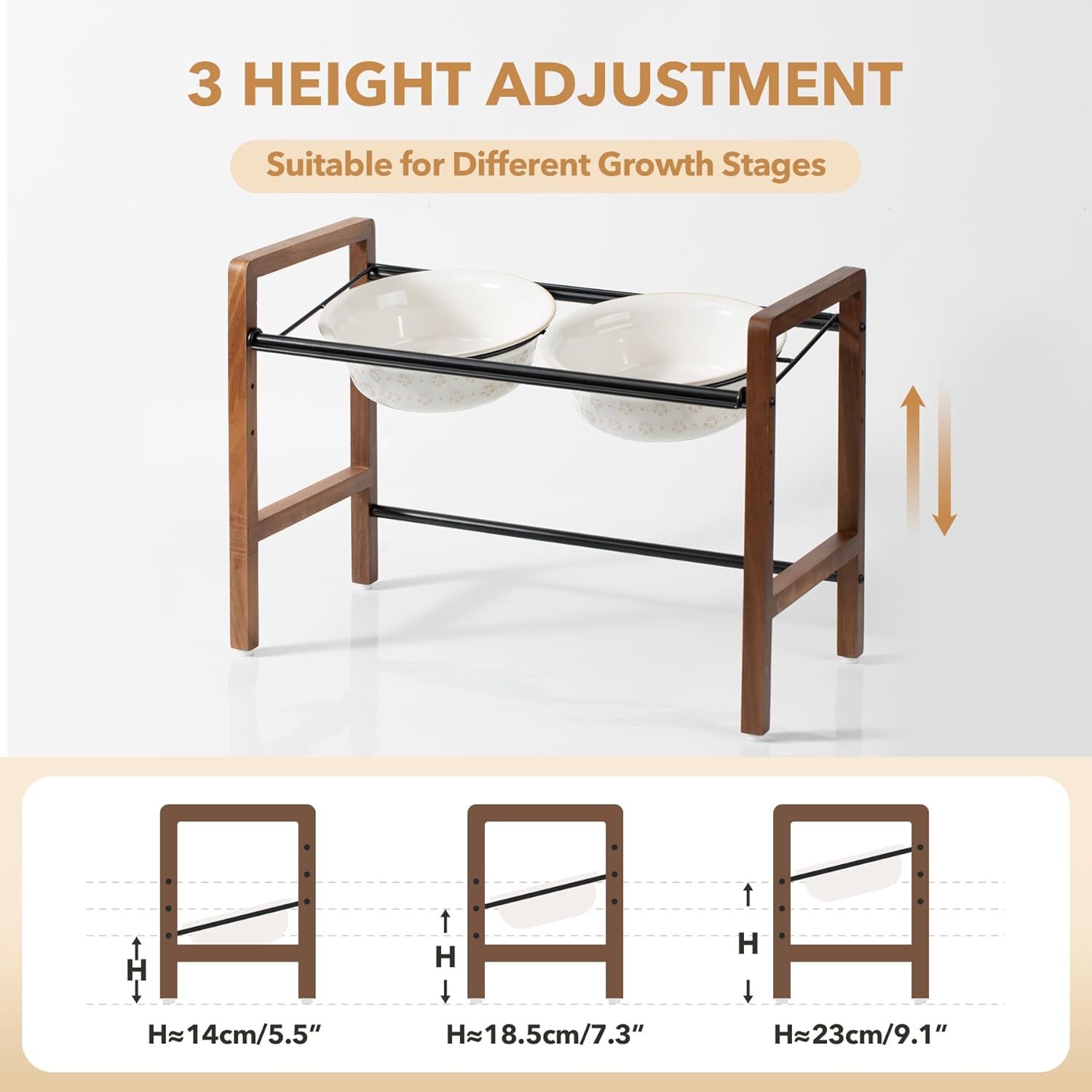 - 3 Adjustable Heights & 2 Placement Options: This stand offers 3 adjustable heights, ranging from 5.5 inches to 8.7 inches, catering to the needs of pets at different growth stages. The circular metal component on top of the stand features two distinct placement options, allowing the bowls to be either horizontally aligned or tilted. Our products are designed to help protect the pet's cervical spine and meet their diverse needs.