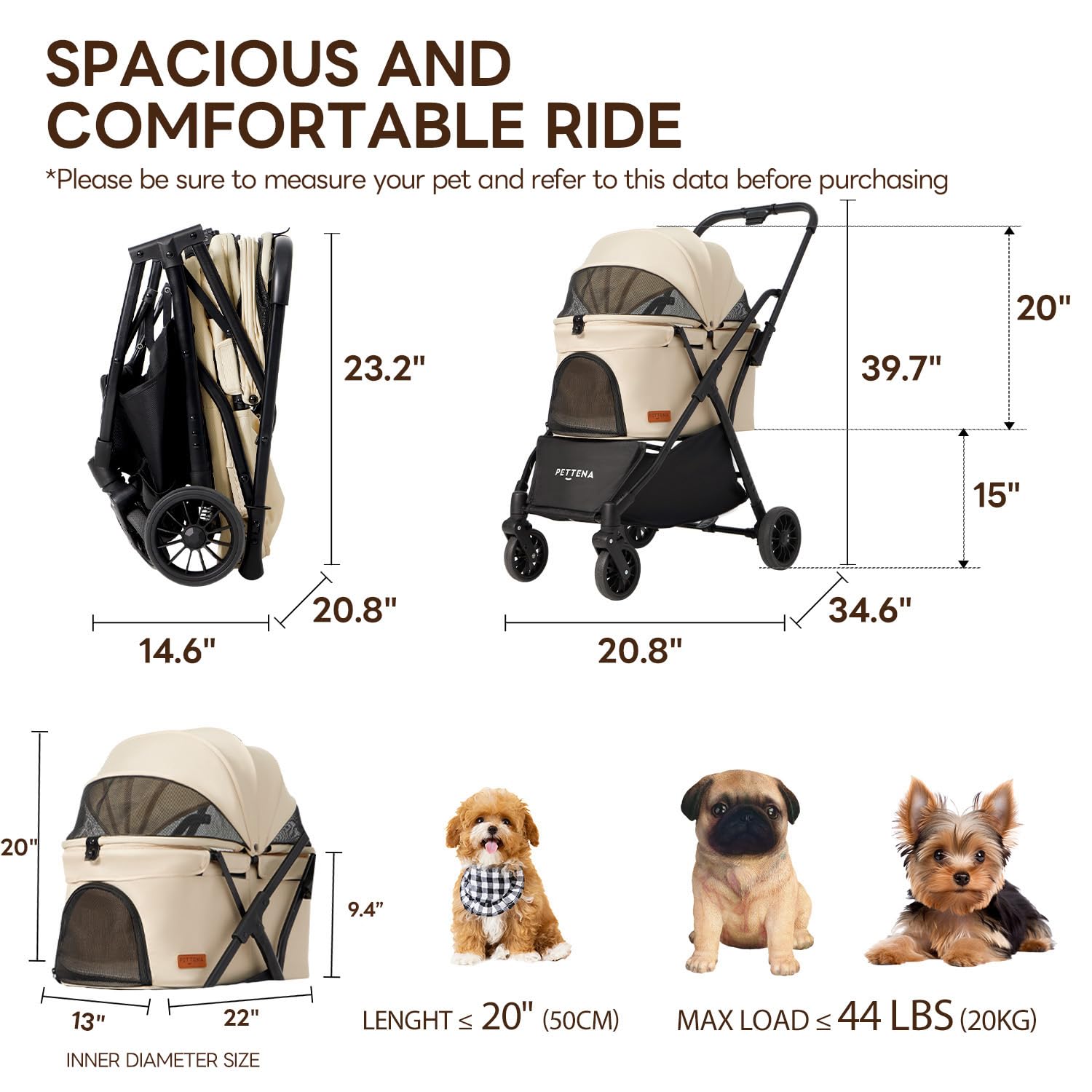 【One-Pull Open Ver.】 PETTENA Dog Stroller for Small Dogs, One-Touch Foldable Dog Stroller for Small/Medium Dogs Cats up to 44 Lbs, Khaki
