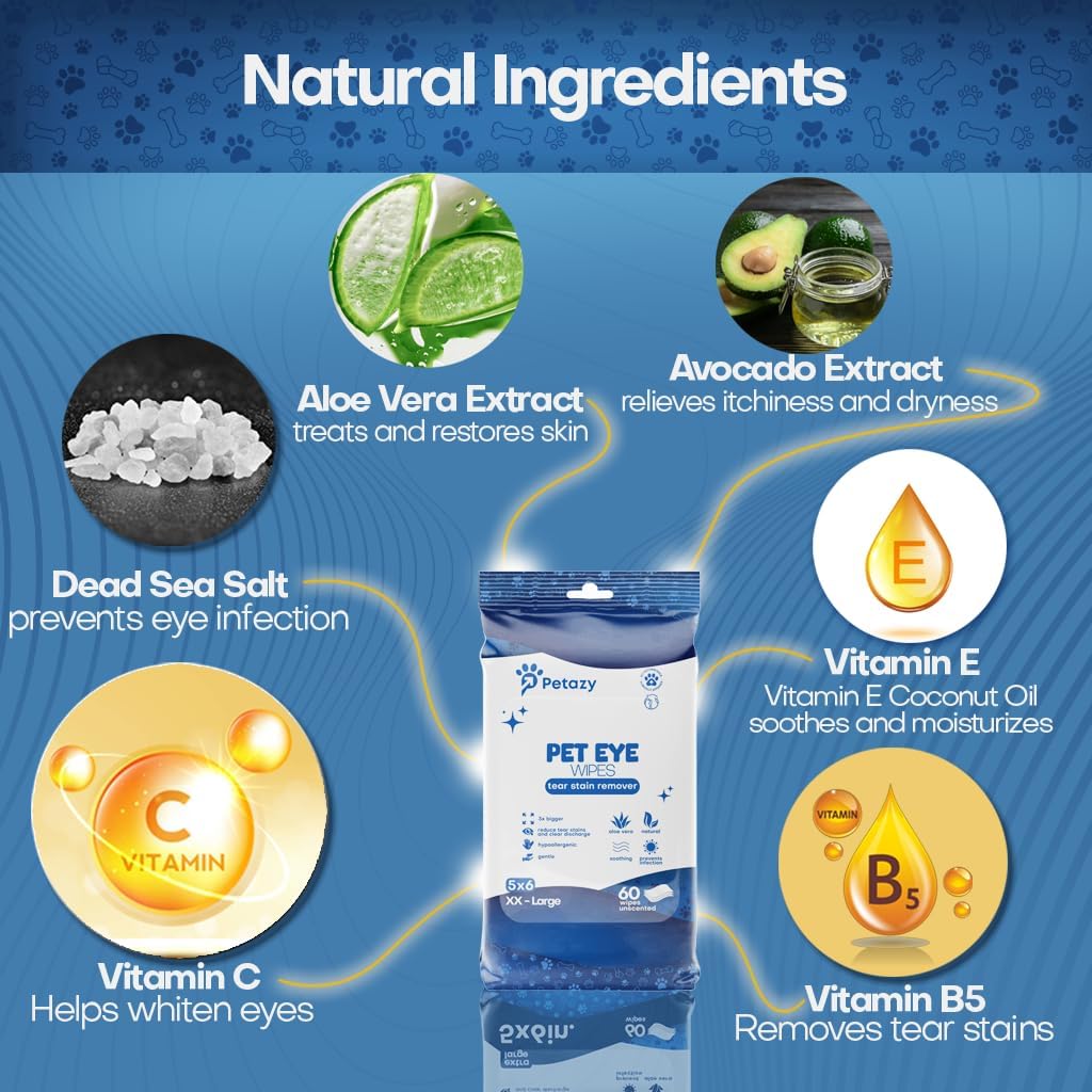 Pet Eye Wipes for Dogs | 3X Larger Unscented Hypoallergenic Gentle Eye Cleaner Wipes for Dogs & Cats | Pet Tear Stain Remover Wipes | 60 Count