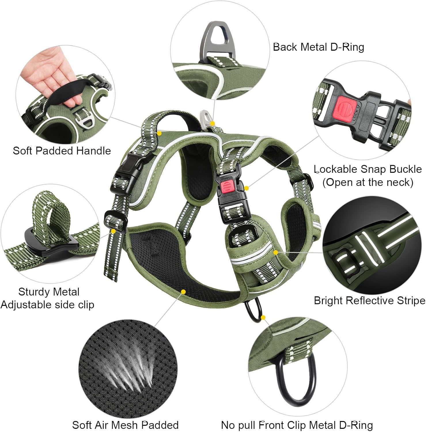 Timos Dog Harness Medium Sized, No Pull Pet Harness with Neck Lockable Snap,No Choke Front Clip Dog Reflective Vest,Adjustable Metal Rings 3 Buckles,Easy Control Handle for Medium Dogs Green M