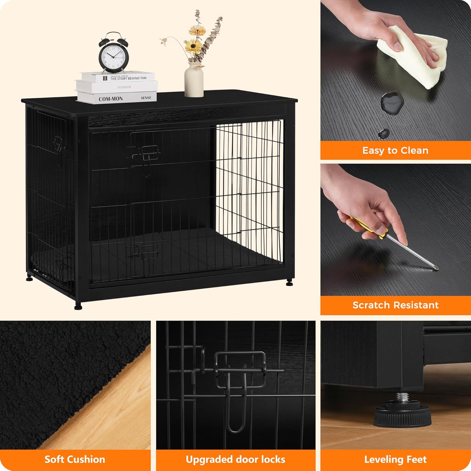 DWANTON Dog Crate Furniture with Cushion, Wooden Kennel Table with Double Doors, Indoor Dog House, Large Size, 38.5" L, Black