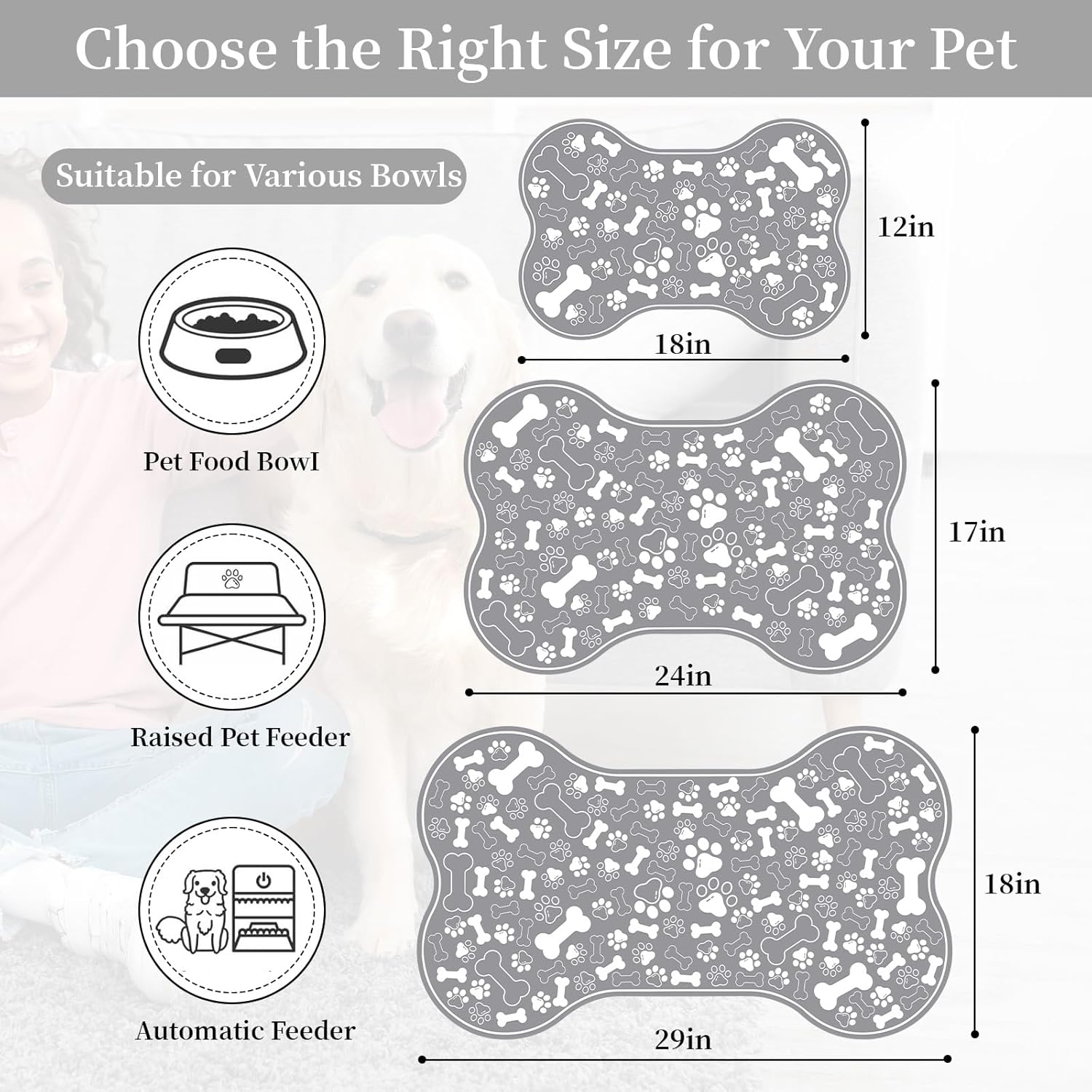 - CUTE AND FASHIONABLE DESIGN: Our pet feeding mats are designed with dog paw and bone motifs, very interesting. It is available in a variety of colors, sizes and shapes to provide a unique dedicated space for your pet's food and water bowls, and you can choose a style that matches your home dΓ©cor.