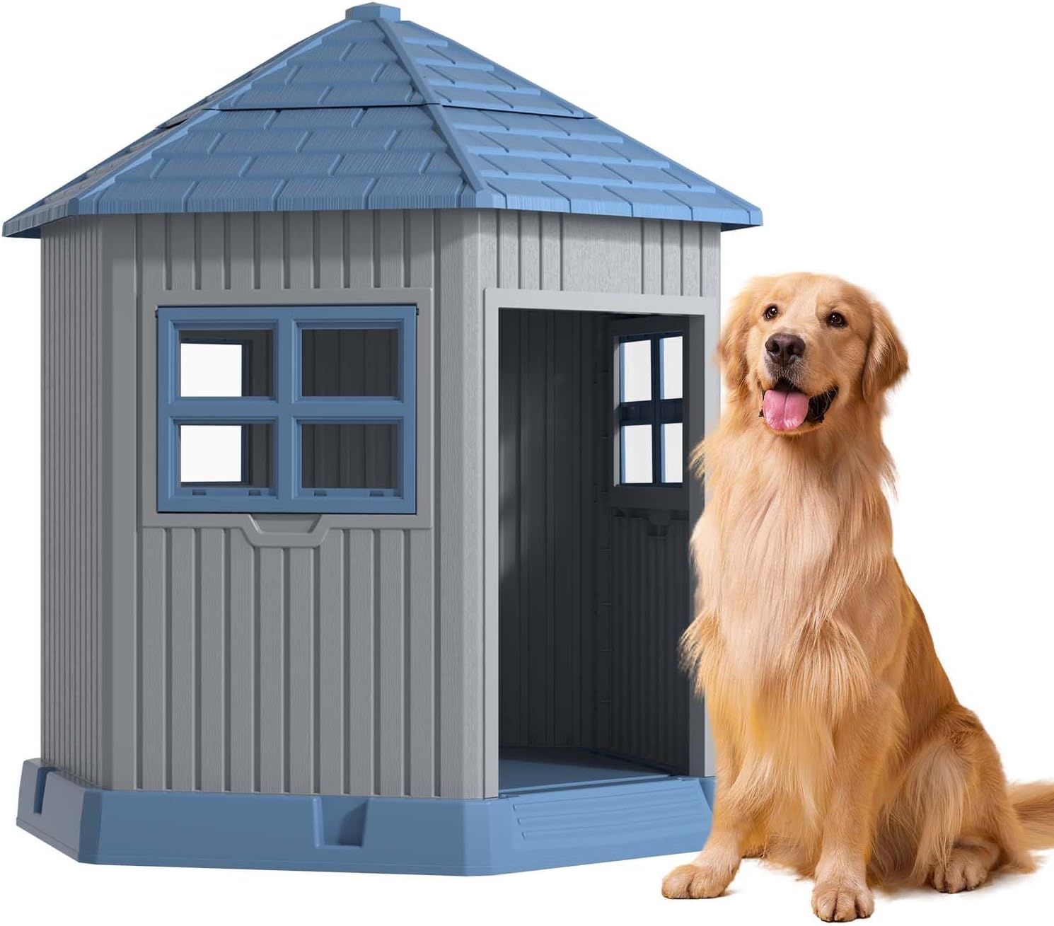 Vixzen Large Outdoor Dog House,Durable Water Resistant Resin Dog House,Doghouse for Small to Large Dogs Indoor or Outside,with Openable Windows and Elevated Floor,Blue