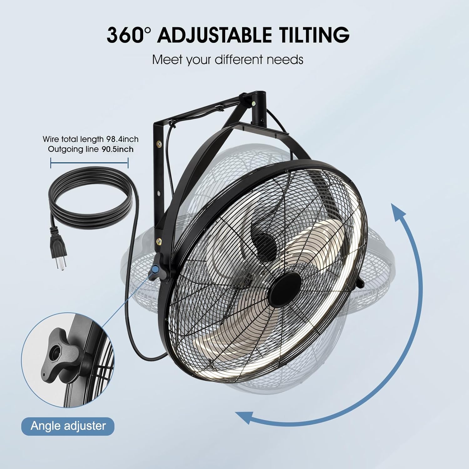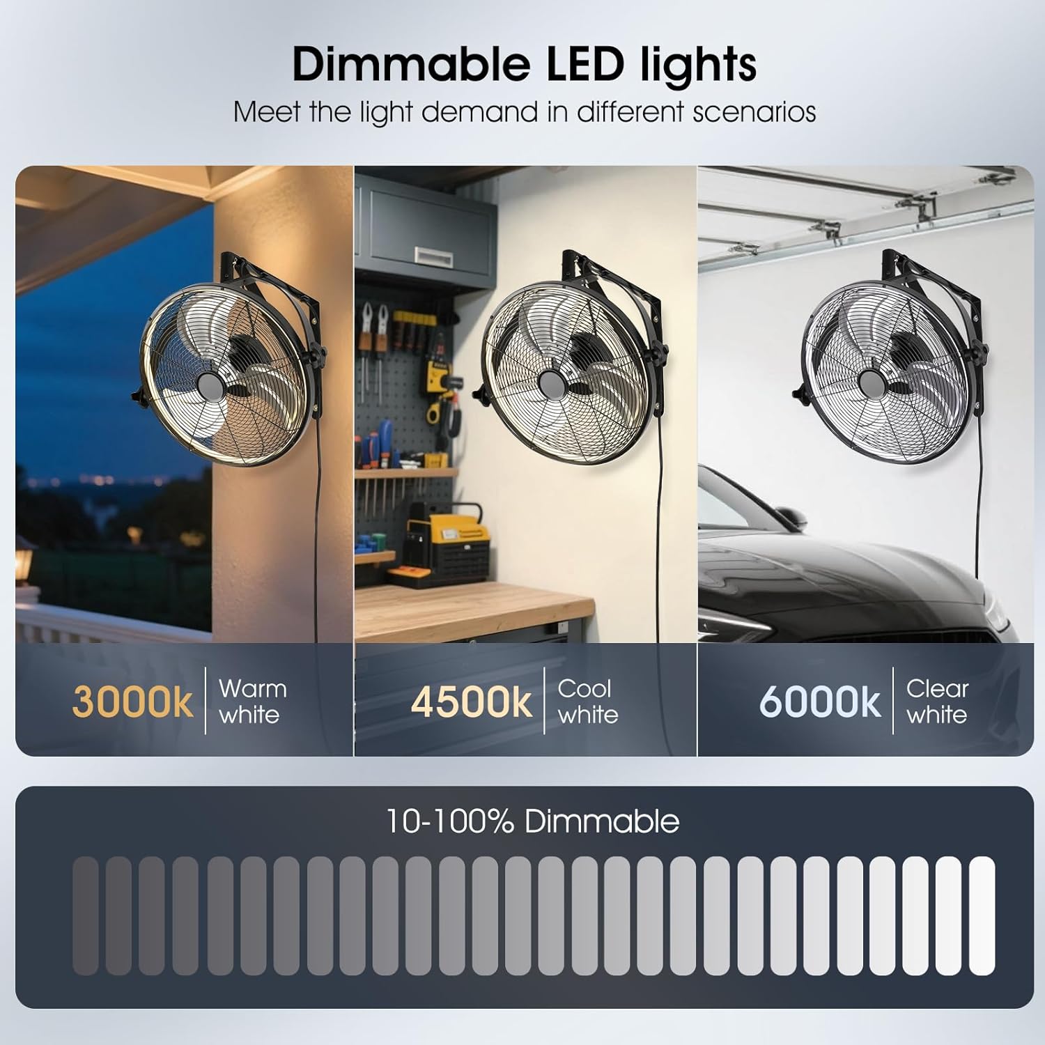 - ăWall Mount FanăOur wall fan with full metal casing,safer.The fan combines cooling and lighting in one,you can adjust wind speed,light,timing,reversible and many other functions,comes with a 7.5ft power cord,giving you the flexibility to place the outdoor fan in covered patios,garages,warehouses and factories.