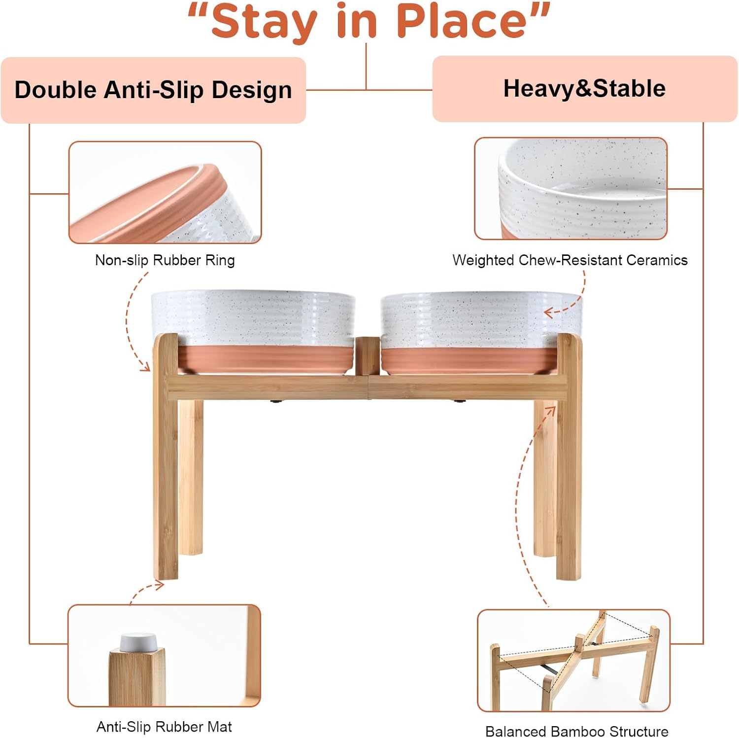 - Stable, Tip‑Resistant Design – A solid bamboo frame with Chew‑Resistant Heavyweight Ceramic, wide stance, and slip‑proof silicone pads join forces to create raised dog bowls that STAY IN PLACE on tile, wood, or laminate. Fewer spills mean cleaner floors and no accidental gouges or scratches or noisy