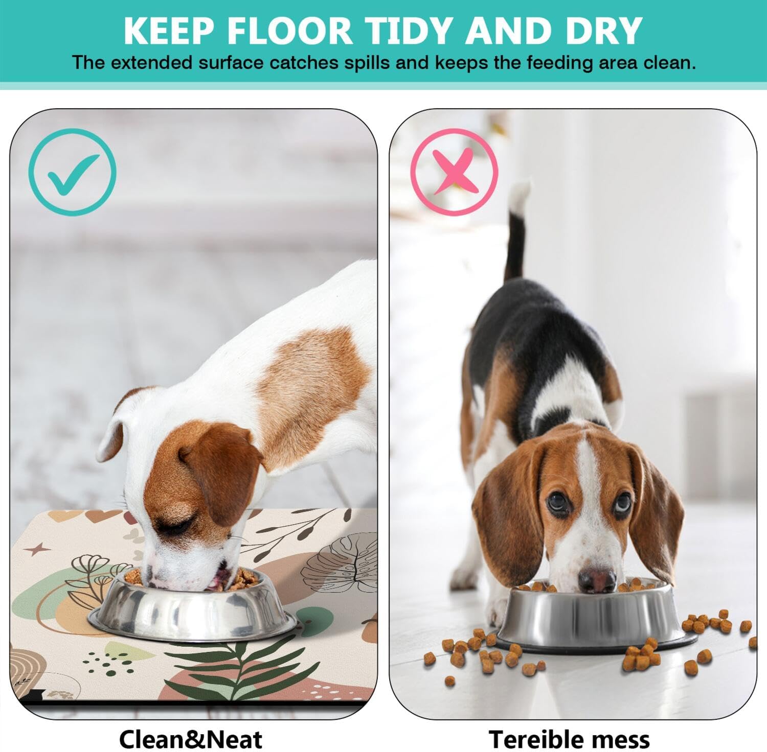 - Waterproof & Easy Clean Dog Food Mats for Floors Waterproof - Unlike regular mats, our heavy-duty dog food mat features a 100% waterproof layer that prevents liquids from seeping through the floor. Simply wipe clean your dog bowl mat after meals - no staining or odors! Works great as both a dog food mat and cat food mat.