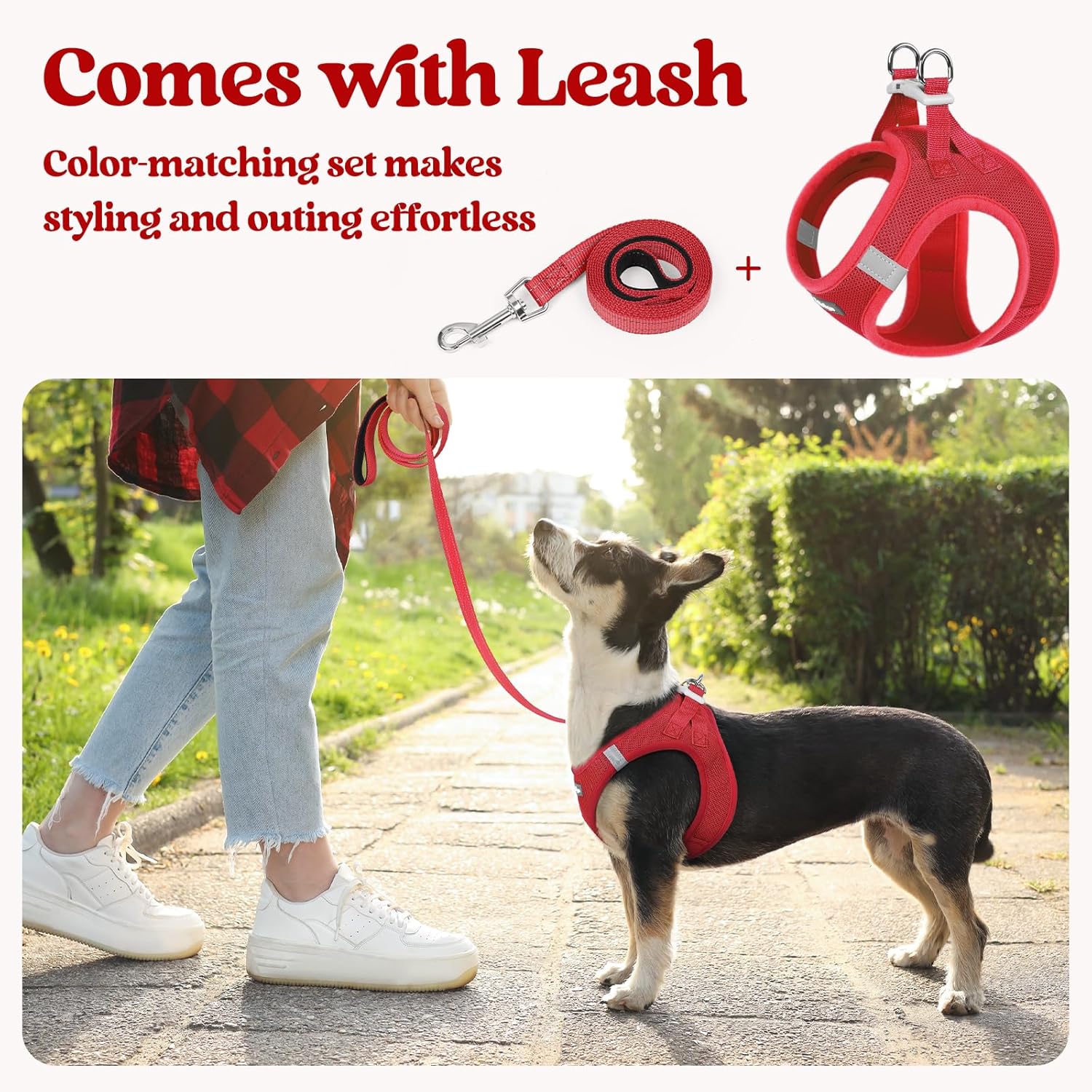 - Dog Harness with Leash Set๏ผThe color-matching harness and leash with reflective bands make it fashion and visible for pet outing. The leash is 5.15ft in length, with an anti-tangling clip and a palm-friendly handle