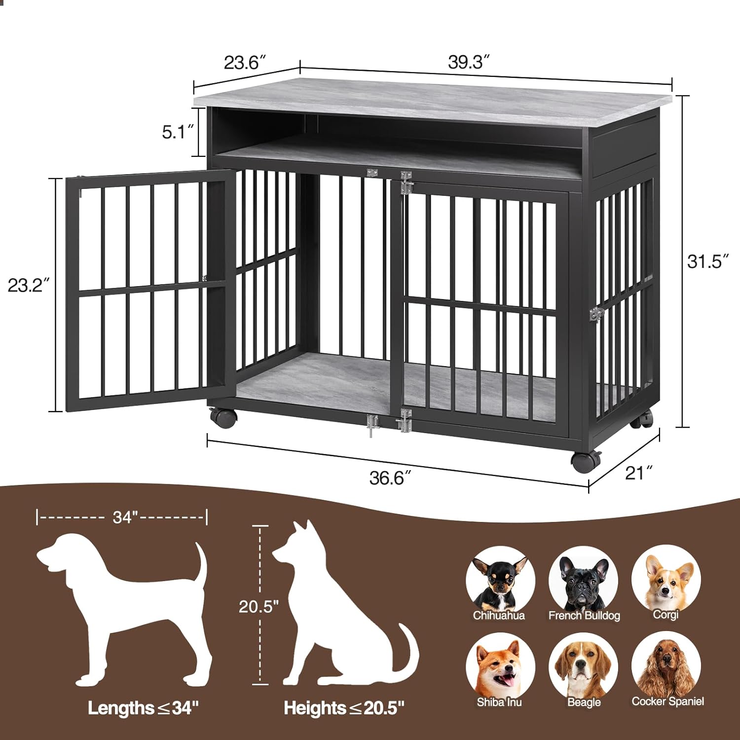 - For Medium/Large Dogs: Overall size is 39.37"L x 23.62"W x 31.5"H. Cage inner size is 36.61"L x 21.06"W x 23.23"H. It can support up to 150lbs with heavy duty wood. Perfect for various medium to large dogs. Please choose the right dog crate according to your pet's size to ensure their comfort.