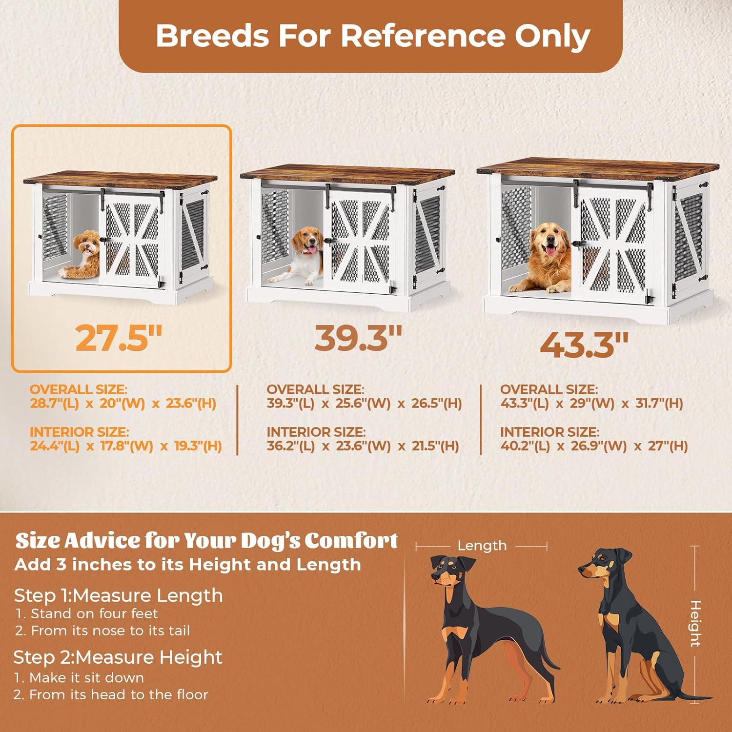 - Measure Your Dogs Before Purchase: The interior size of the dog kennel furniture is 24.4"L x 17.8"W x 19.3"H and the weight capacity is up to 70 lbs. Add 3-4 inches to your dog's height and length to make sure your dog stays comfortable inside the dog cage