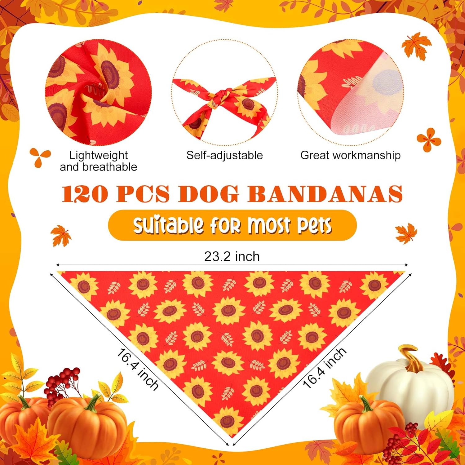 - Adjustable Size for Most Pets: Each fall dog scarf measures 23.2 x 16.4 x 16.4 inches (58 x 41 x 41 cm), fitting small medium and large dogs and cats. Easily fold to suit smaller pets; lightweight fabric ensures comfort
