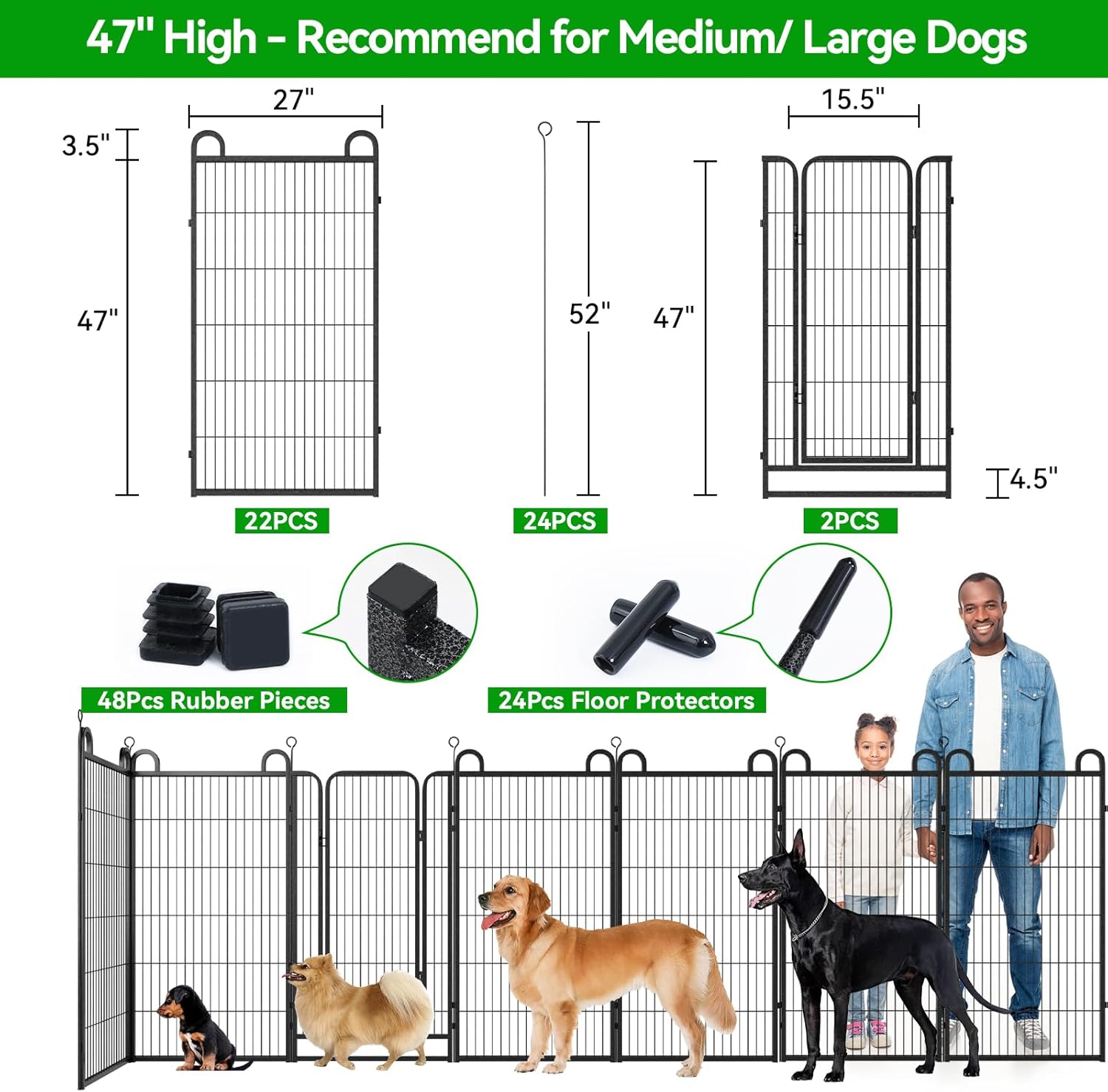 Dog Playpen Outdoor 24 Panels Heavy Duty Dog Fence 47" Height Anti-Rust with Doors Portable for RV Camping Yard, Total 54FT, 227 Sq.ft, Snowy Black
