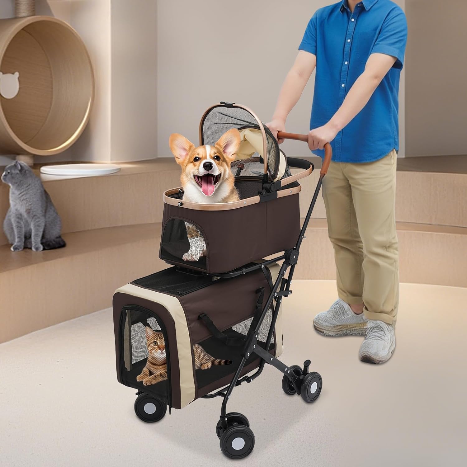 Double Pet Stroller with Detachable Carriers, Large Cat & Dog Stroller with 4 Wheels, Foldable Pet Strollers Small & Medium Dogs Cats 77lbs (Coffee Color)