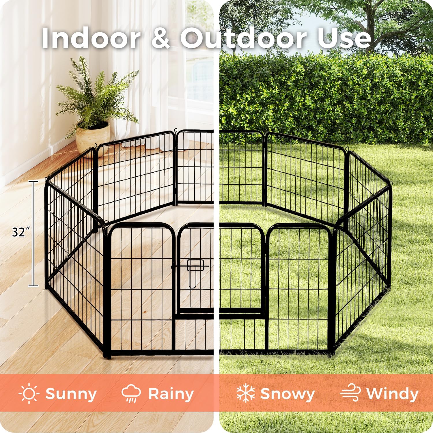 - INDOOR & OUTDOOR PORTABLE DOG PLAYPEN:This foldable dog playpen with rust-resistant powder-coated steel that will help protect against rust and extend in all weather (rain/snow/sun). It fits homes, RVs, or car trunks. We suggest using floor protectors for indoor use (add a dog pad or carpet for comfort), while reinforced stakes secure it for outdoor applications like camping, yards, and gardens.