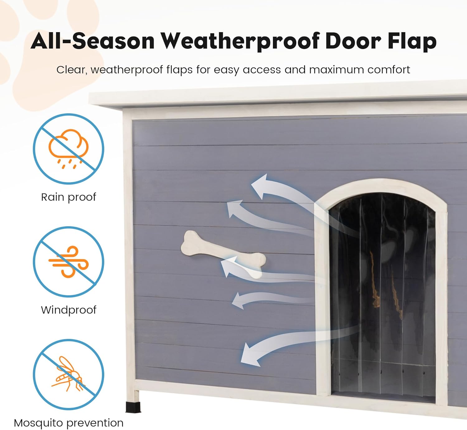 - [Specially Designed for Outdoor Use] The sloping asphalt roof is expertly engineered to prevent rainwater from pooling, ensuring that your pet's living space remains dry and comfortable. The floor is 2.4’’ above the ground, and there is a removable PVC curtain and adaptable floor pads for uneven ground. This design enables the dog house to withstand harsh weather conditions, preventing water from seeping in and materials from getting damp